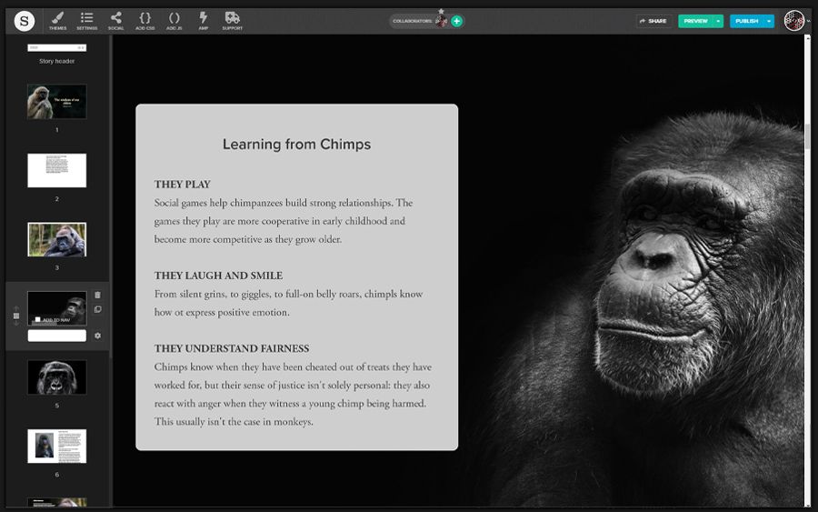 You'll be able to see what your story looks like on desktop, mobile, and tablet viewports, and make adjustments as needed. You can also share your preview link with collaborators, and get pre-publication feedback and quality-assurance.