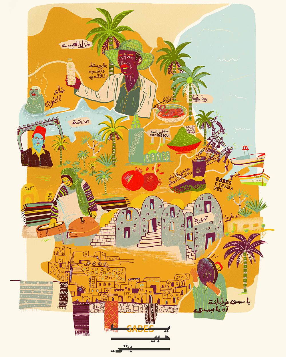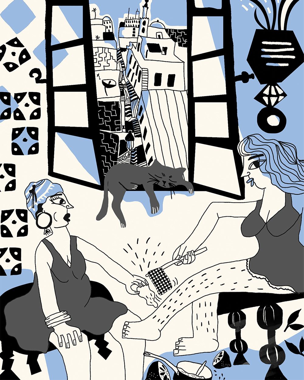 This illustration, “Gossip on the roof”, captures the rooftops in Tunis medina. Rooftops are an important architectural element in Tunisian life, where parties are held, carpets are washed, and, above all, the latest news is exchanged.