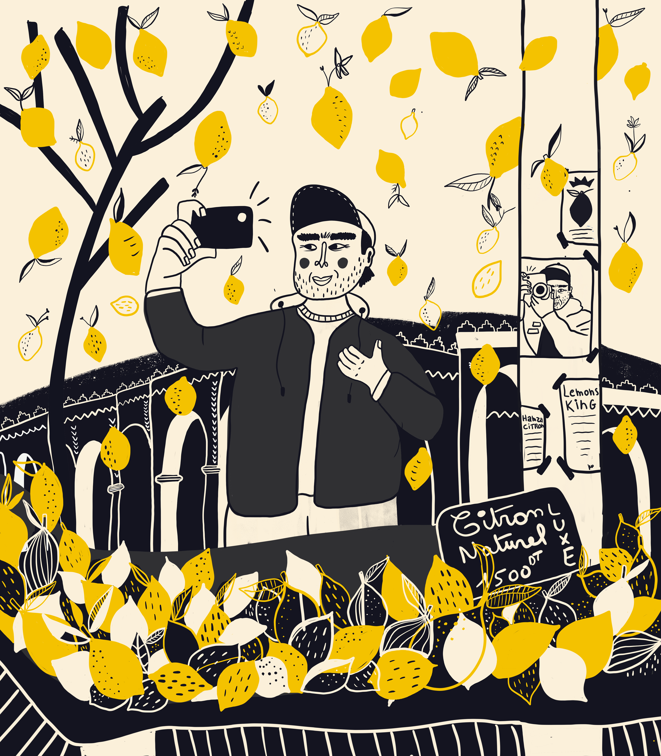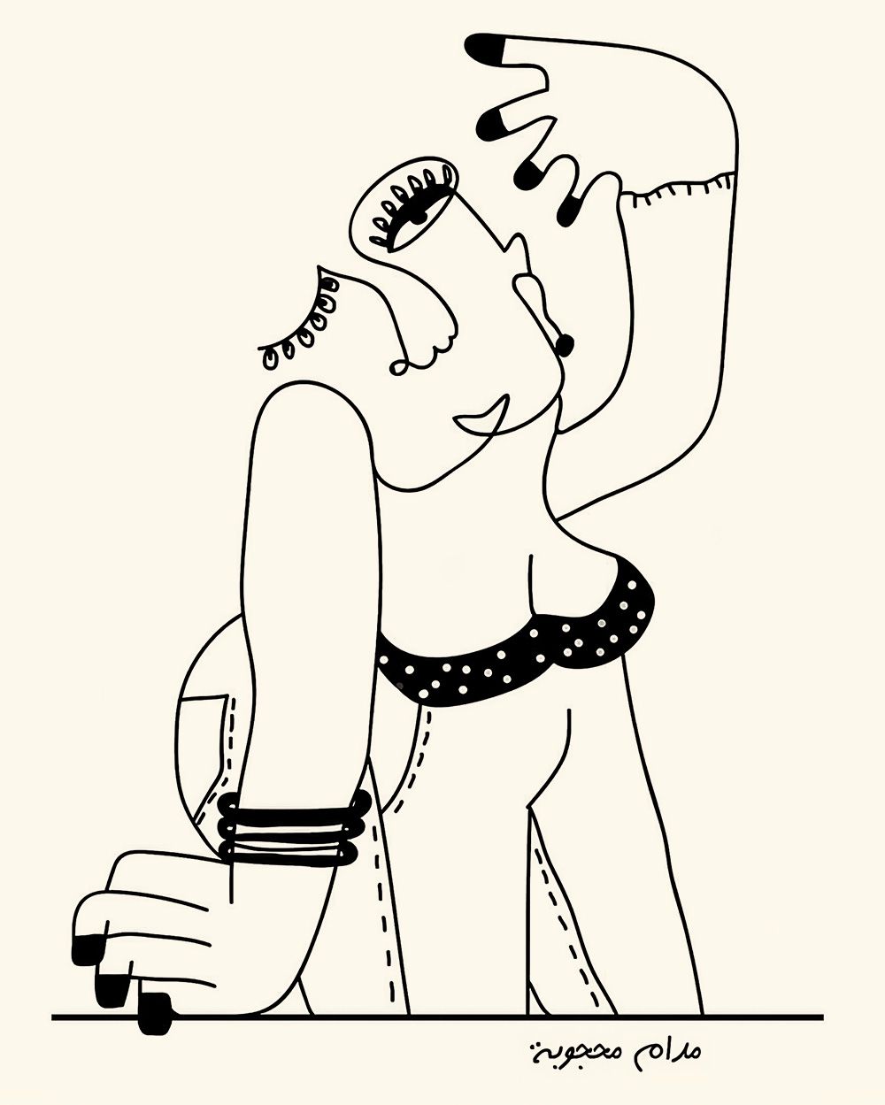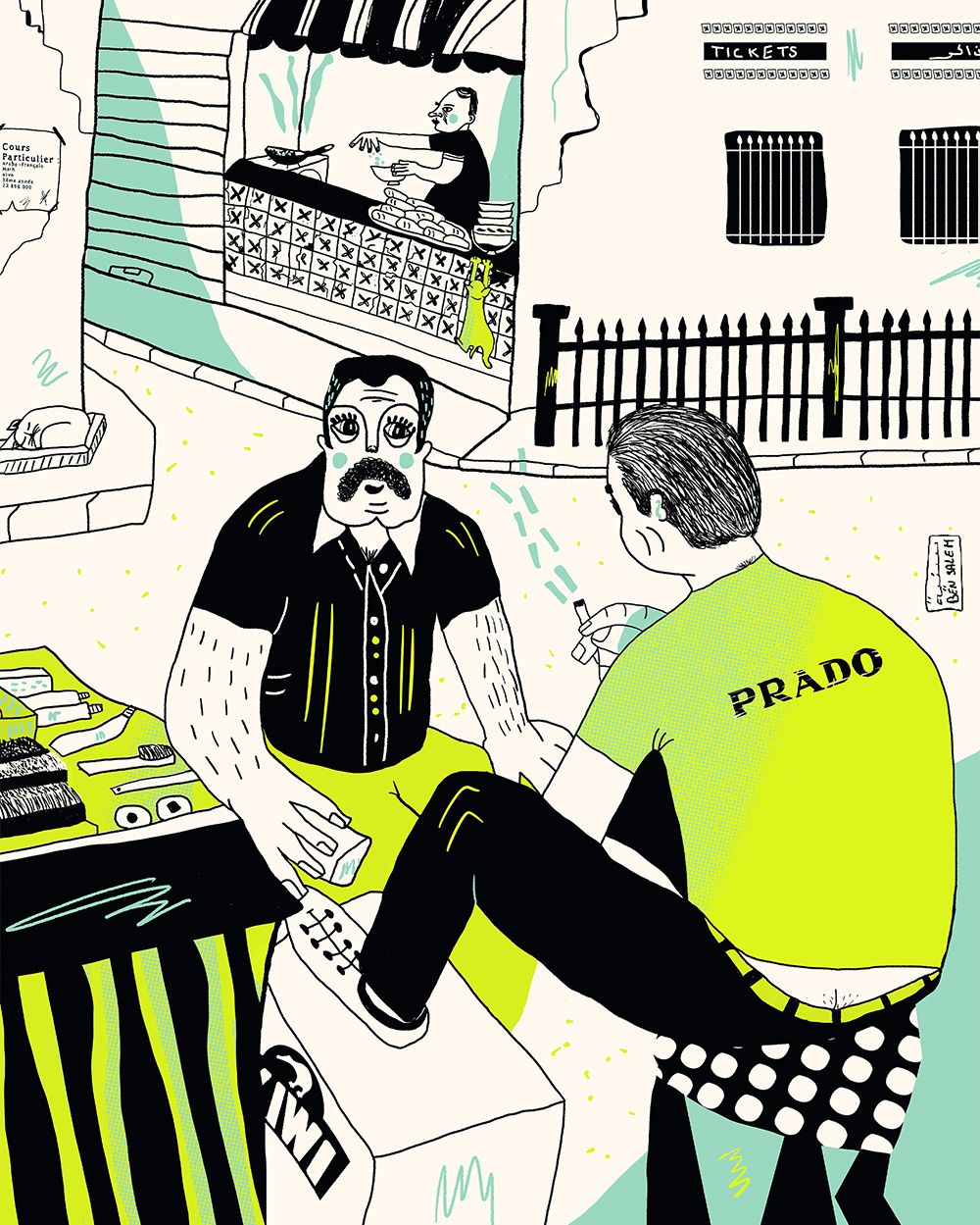 Ben Salem draws Tunisian scenes filled with self-mockery, spontaneity, and humour. These images capture the sensations of her home, and the memories of her grandmother, mint tea, and the smell of jasmine in the streets of Tunis.