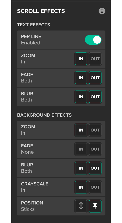 Effects can be applied singly or in combination to both the text and the background image. They also work with the other available sections options including height, overlay, position, etc. This allows for hundreds of possibilities. Mix and match, or create a signature style for your story or your brand.