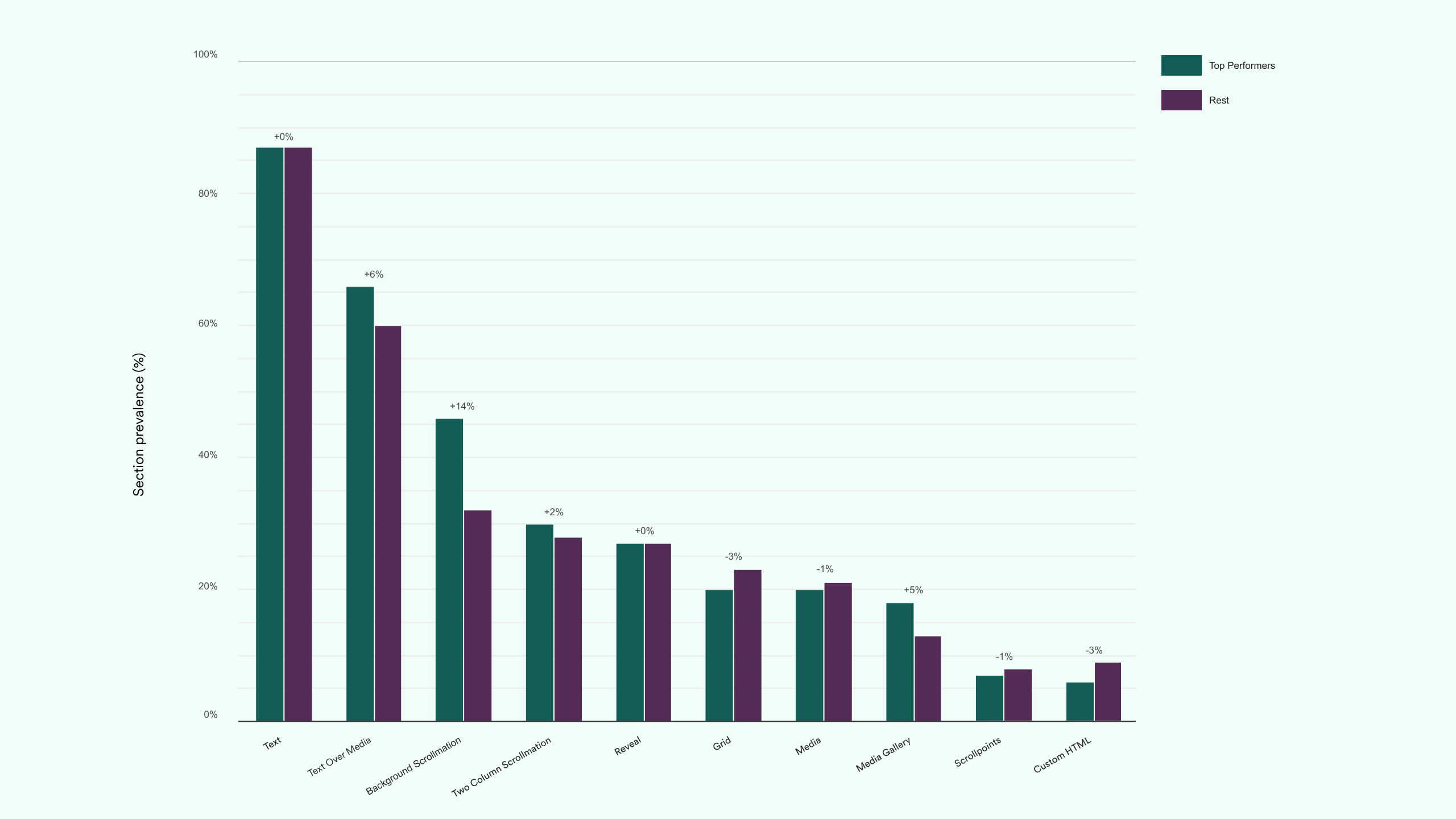 They go heavy on the media-based sections, utilising Text Over Media, Two Column Scrollmation, Reveal, and Media. The only media-based section not used more by top-performing stories is Scrollpoints.